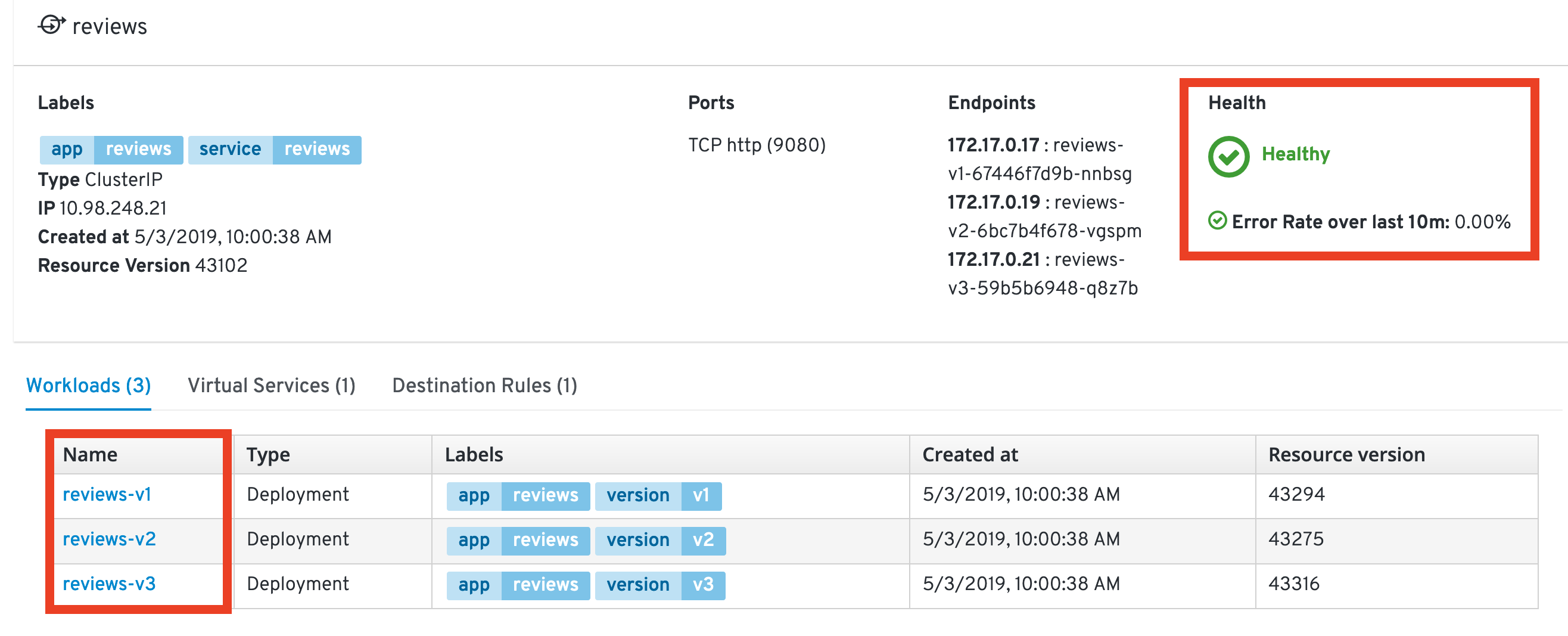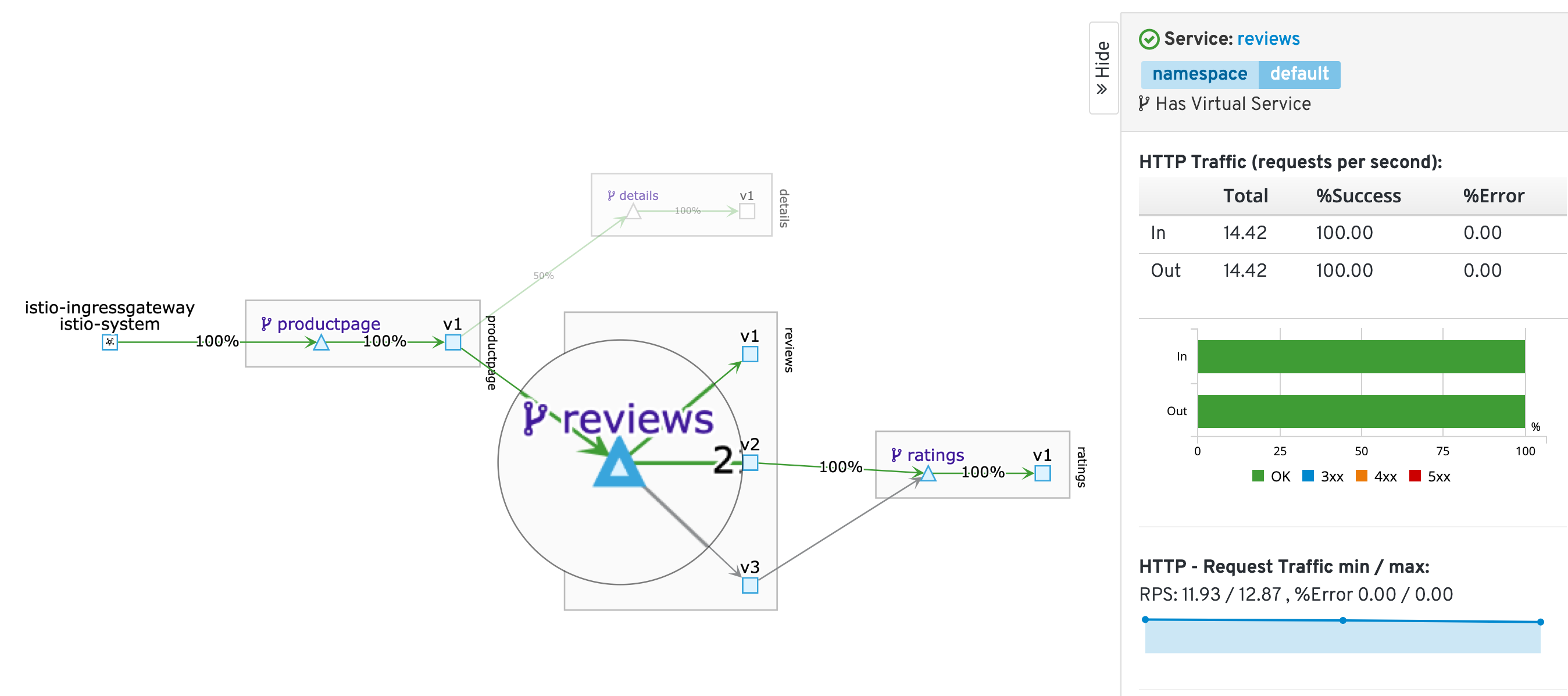 Go back to the Kiali Dashboard and select the reviews service in the graph.