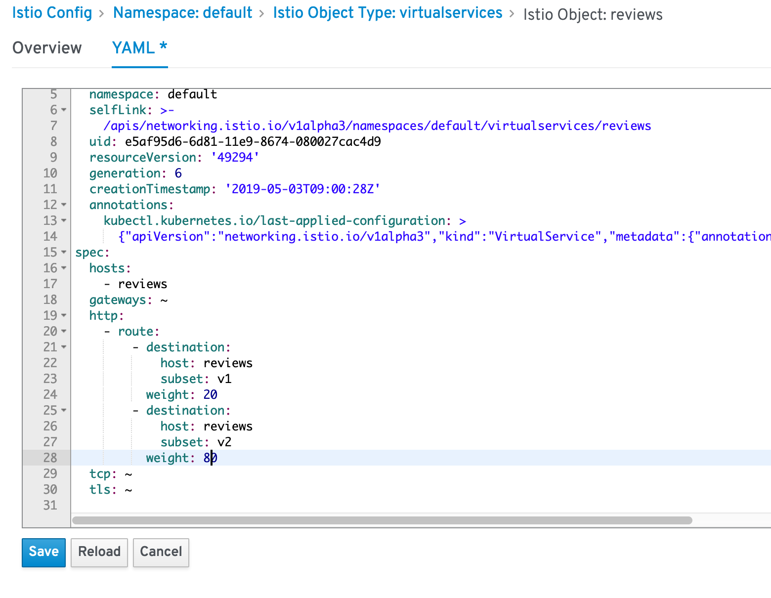 kubectl apply -f ~/training/istio/samples/bookinfo/networking/virtual-service-reviews-80-20.yaml