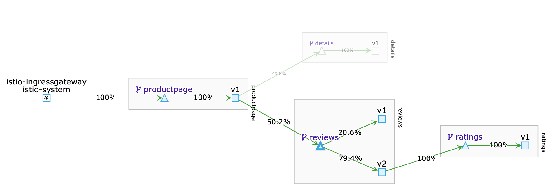 Observe in the Kiali Dashboard. After a short wile you should see that about 20% of the traffic is going to V1 and 90% of the traffic is going to V2.