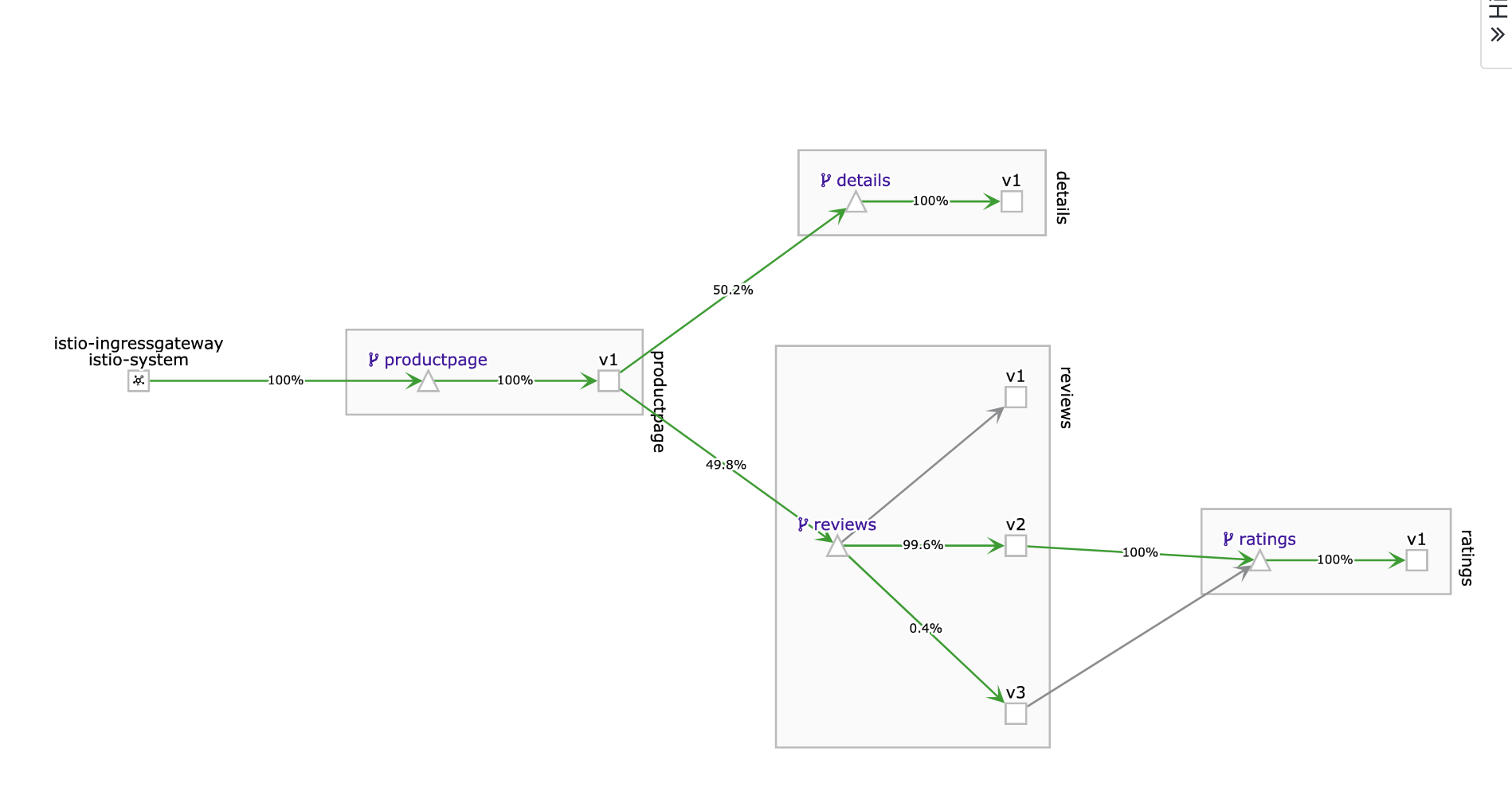Observe in the Kiali Dashboard. After a short wile you should see that a small percentage of traffic is going to V3, which corresponds to your page refreshes.