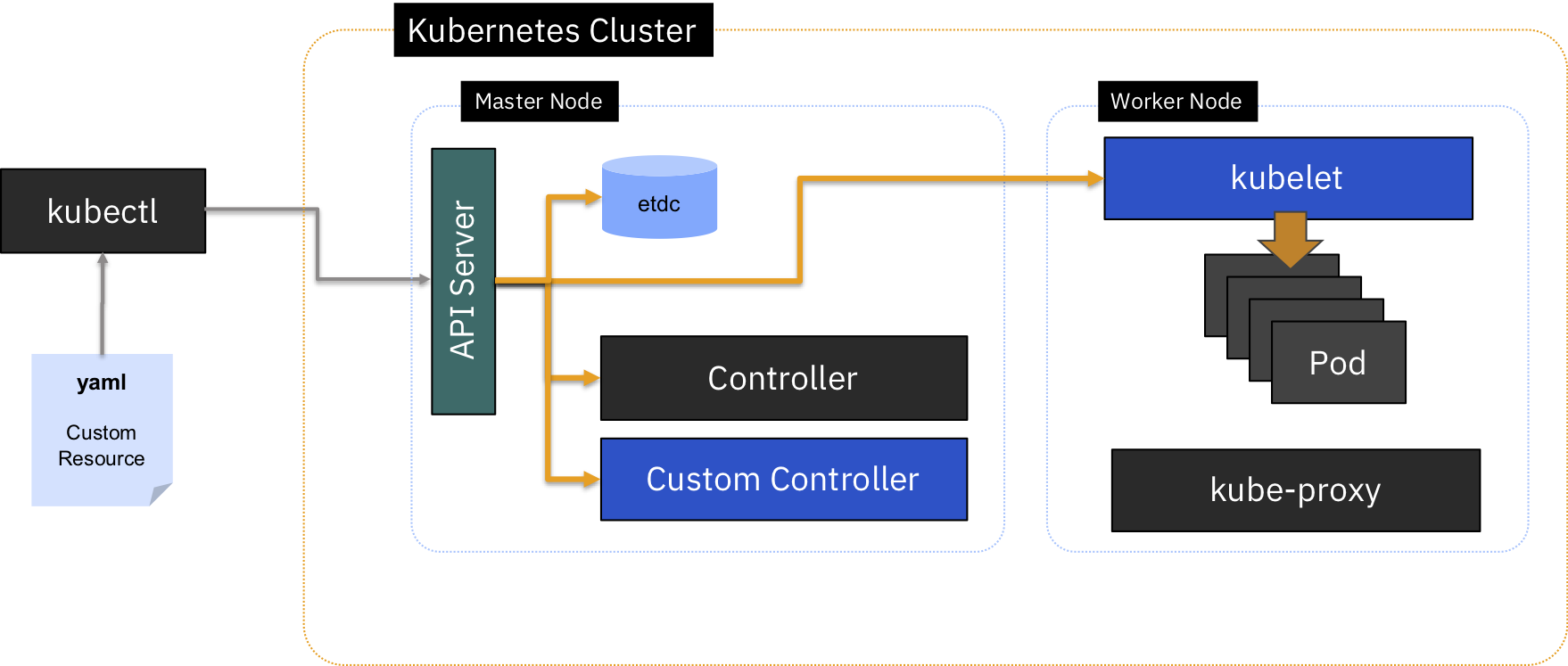 The application you want to watch is defined in Kubernetes as a new object: a Custom Resource (CR) that has its own yaml spec and object type (in K8s, a kind) that is understood by the API server.