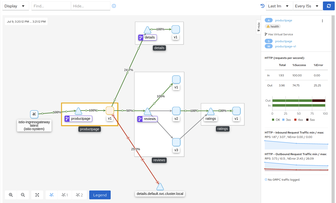 kubectl apply -f ./istio/samples/bookinfo/networking/fault-injection-details-v1.yaml> virtualservice.networking.istio.io/details created> destinationrule.networking.istio.io/details createdIn Kiali click on the productpage (orange) box and after a short while you should see 500 errors appearing. In the right side dtail panel you will see additional information about the problem in your communication between microservices.